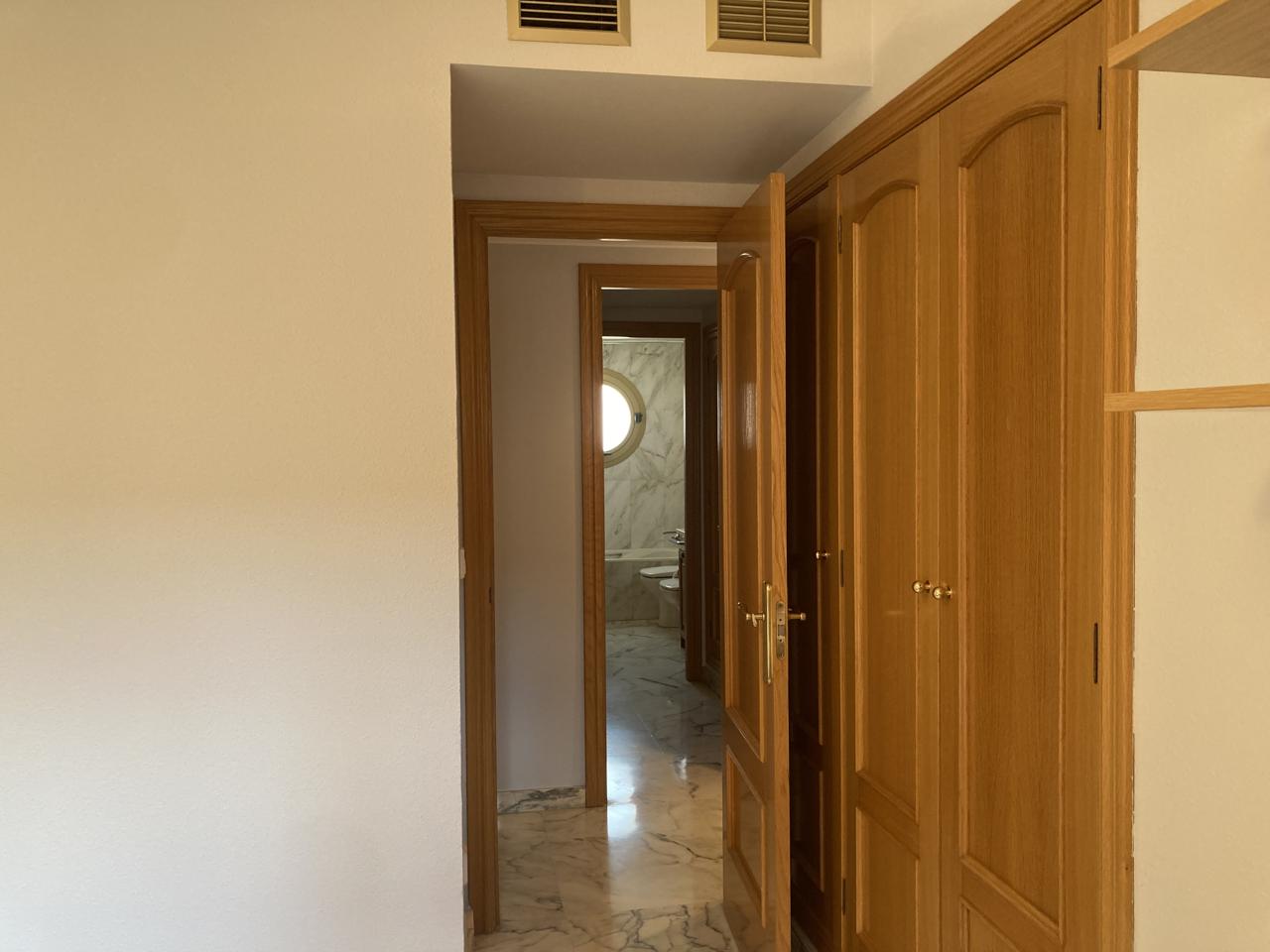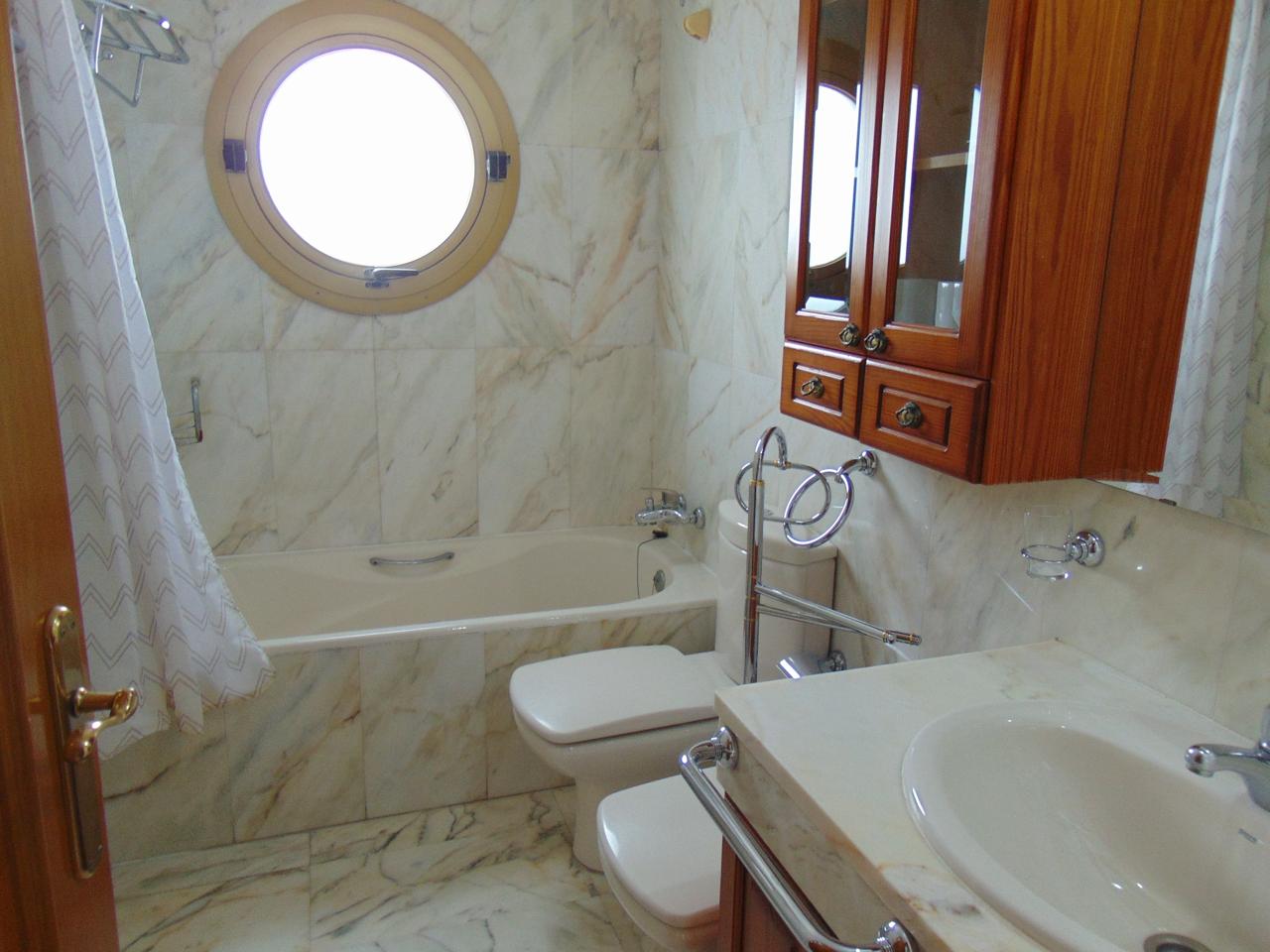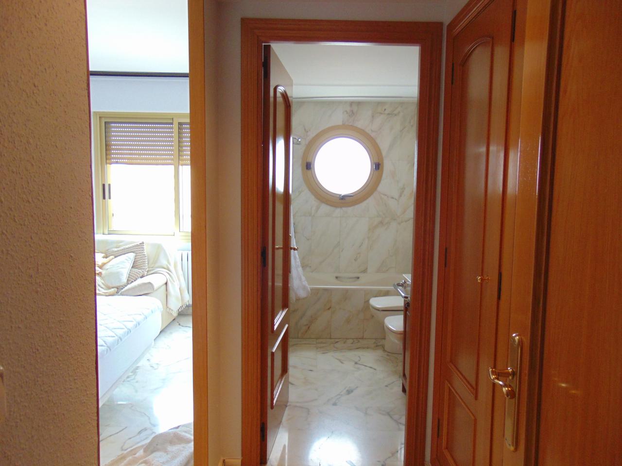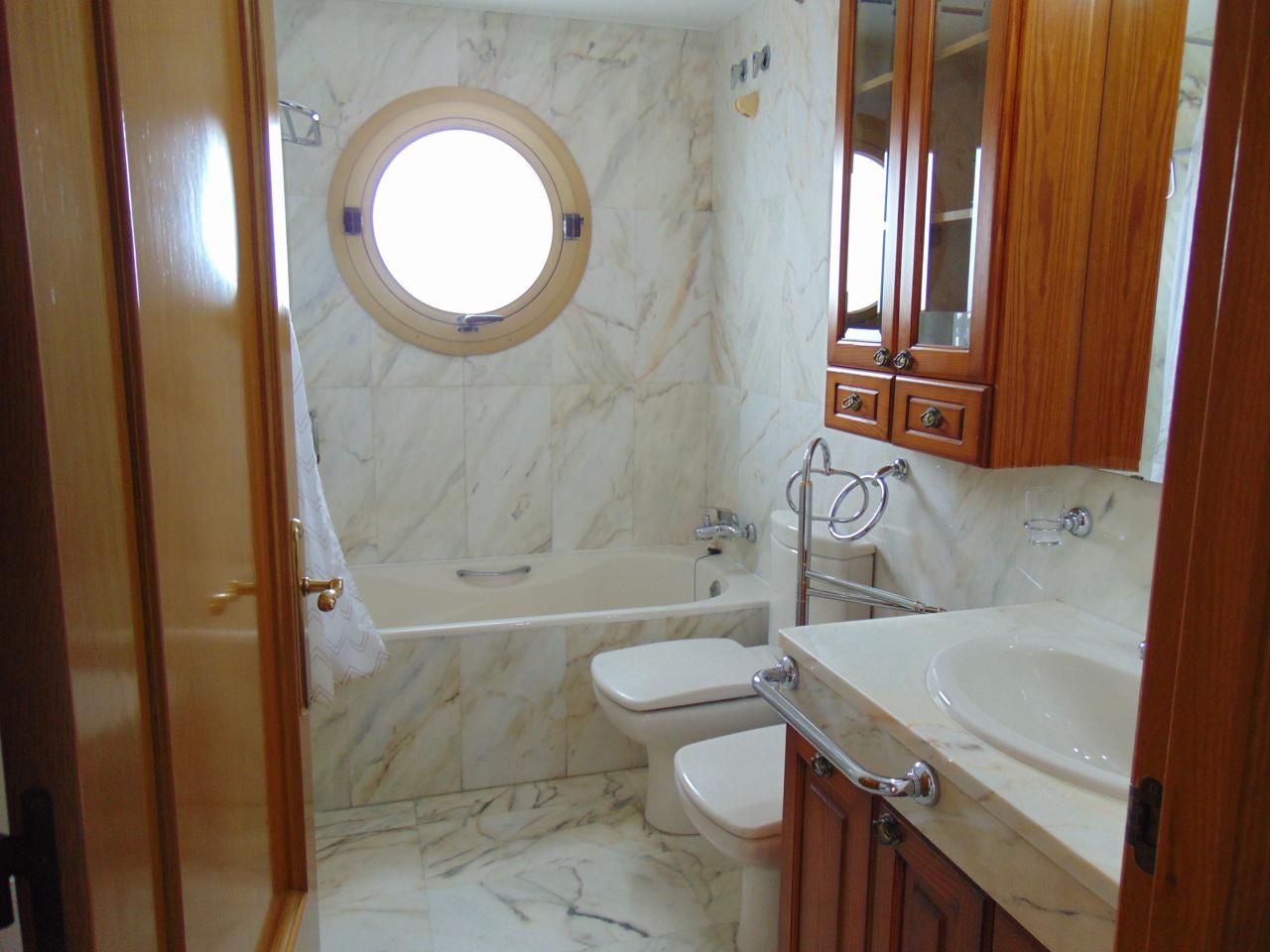 Dormitorio Principal en Suite con Gran Armario y Baño Incorporado de Mármol con Ventana de Ojo de Buey y Bañera.